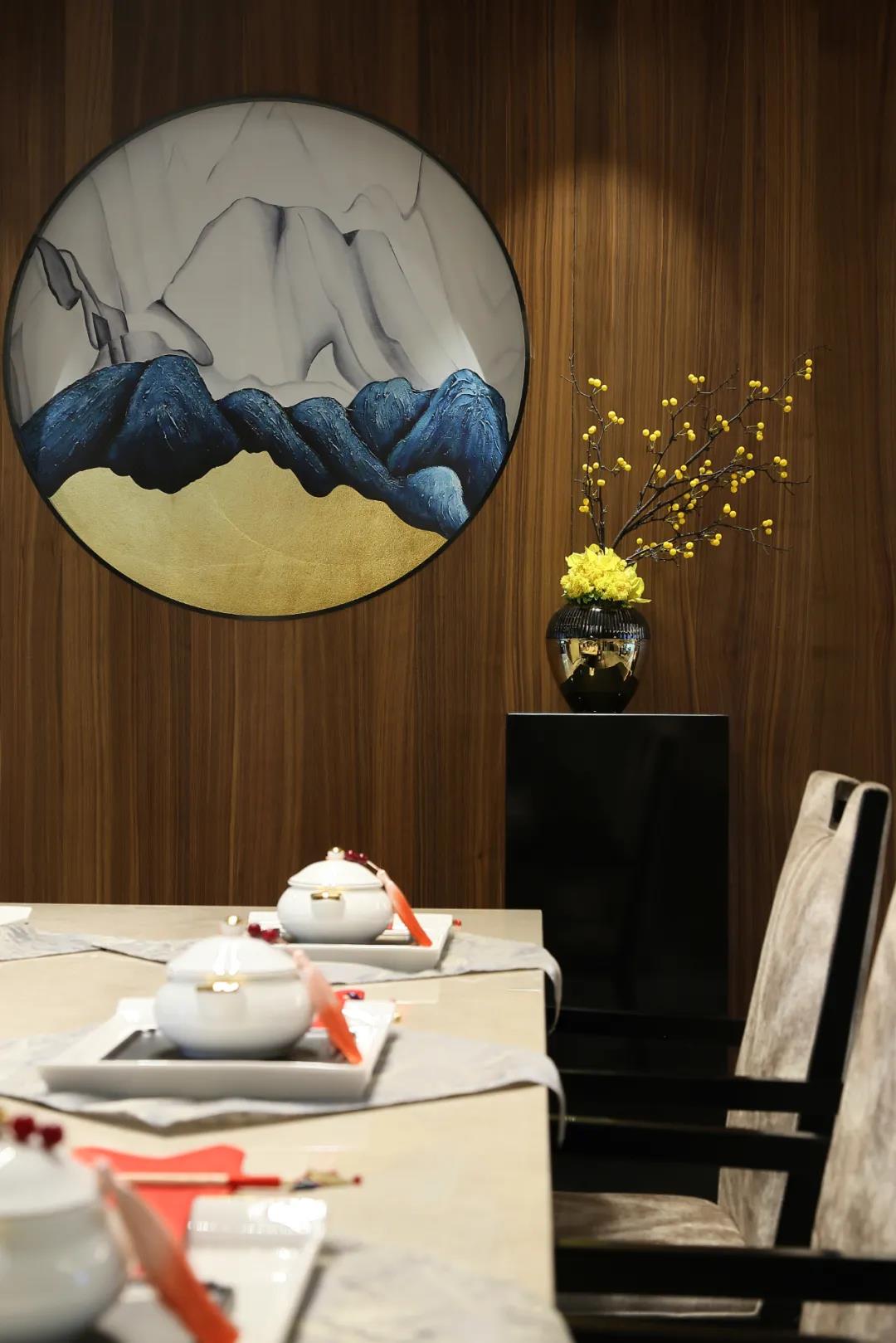 线条流畅的圈椅、加入中式元素的沙发,复古长凳、钱币镂空仿玉坐凳,四个看似无关的个体通过围合的摆放方式形成自然的气韵整体,远山风景画背景墙配以檀色置物架,有品有味实用感十足。