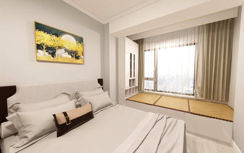 卧室也同样选择了一些融合的元素,带有强烈日式风格的飘窗搭配,北欧风格的简约大床,毫不违和,反而让人觉得很温馨。