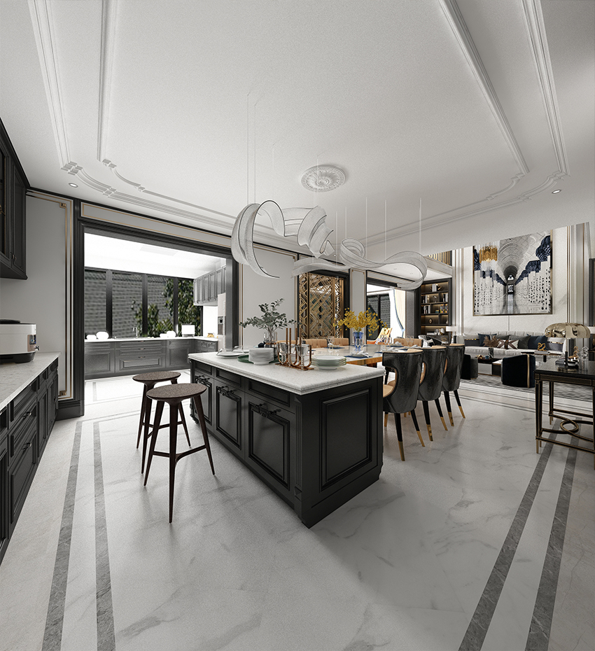 本案整体表现为法式轻奢,业主是一名成功女性有多家公司 对精致的东西很有研究。本案以法式雕花元素和金属去融合搭配,偏向于现代。因为房子比较大,在布局人的动向做了很多调整,设计里有很多都是双向通道,增加房子内部的一个流动性。
